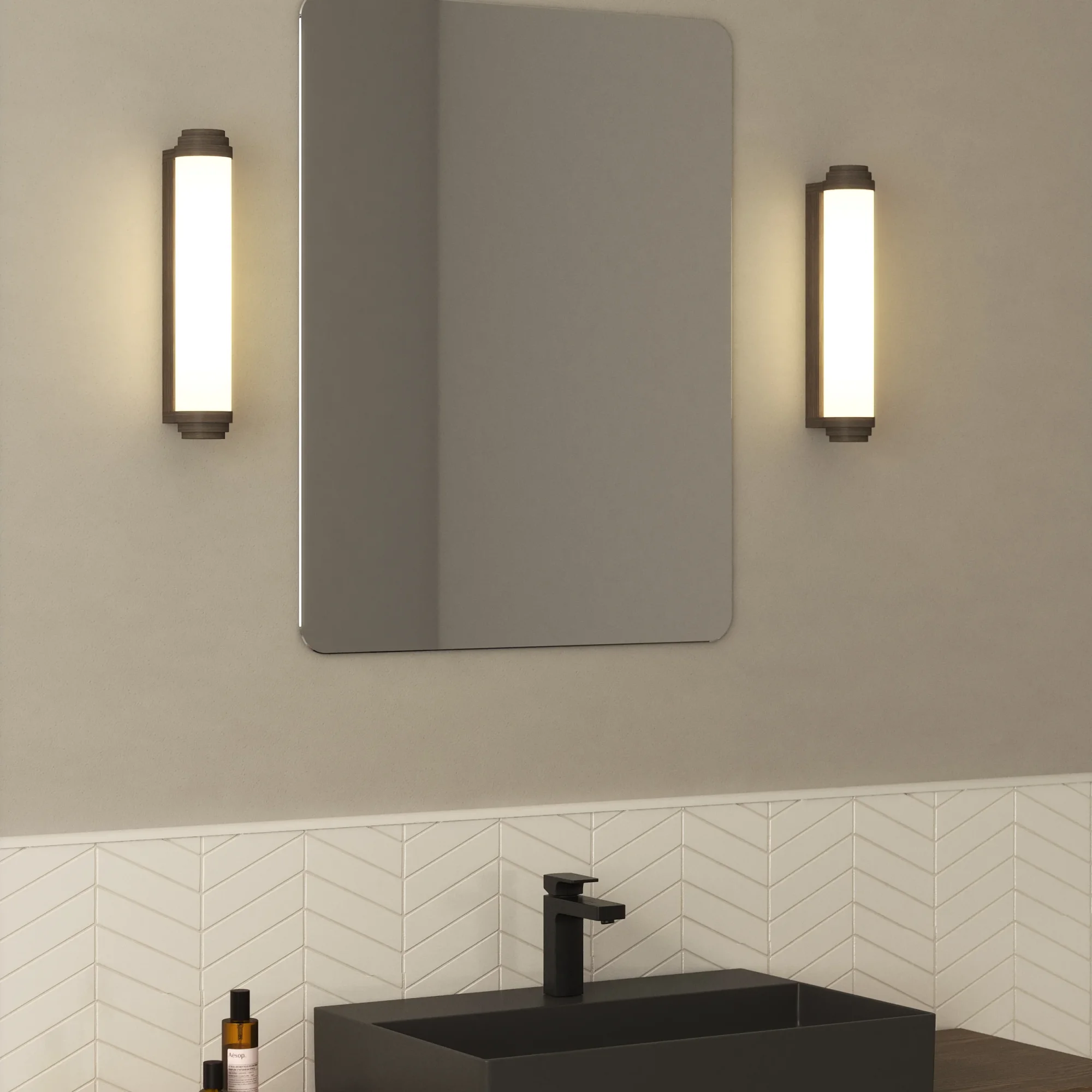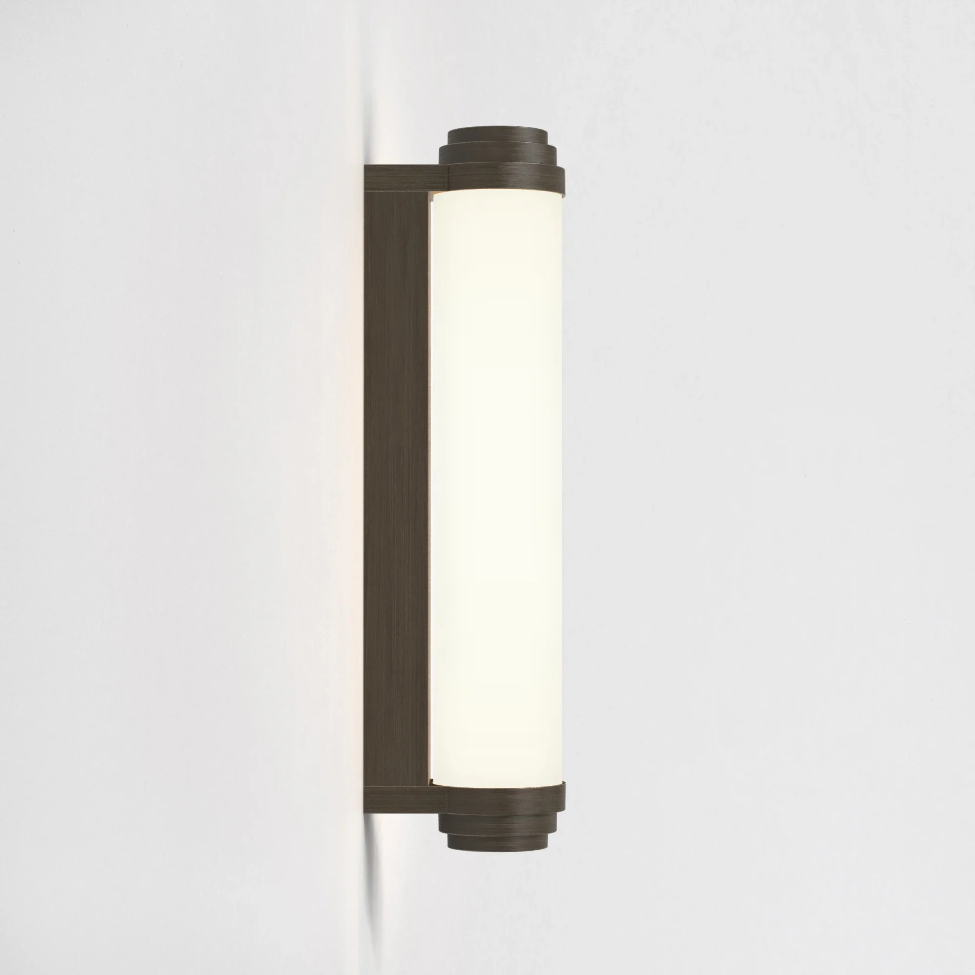Burlington 400 to elegancki kinkiet ścienny, inspirowany Art Deco, w kolorze brązu. Idealnie nadaje się do montażu przy lustrze łazienkowym lub w korytarzu. Montowana poziomo lub pionowo cylindryczna forma Burlington z opcją ściemniania nada wnętrzu mieszkaniowemu lub komercyjnemu wyrafinowany wygląd.