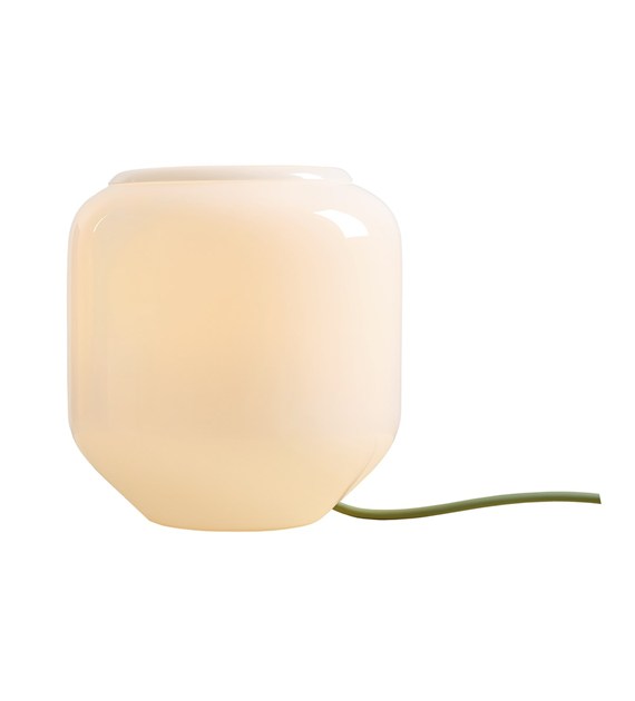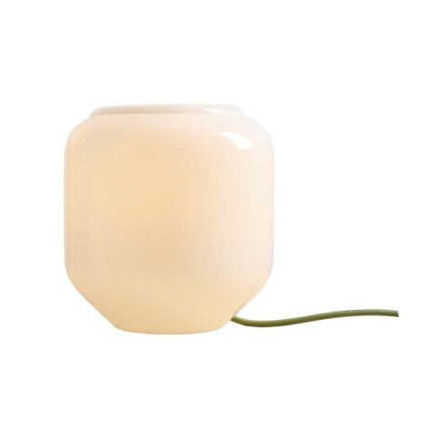 Lampa stojąca z zielonym przewodem w oplocie, klosz wykonany z opalowego szkła.
