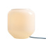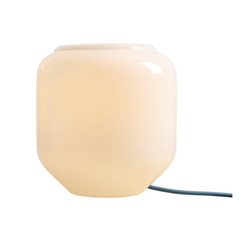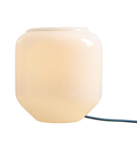 Lampa stojąca z szafirowym przewodem w oplocie, klosz wykonany z opalowego szkła.
