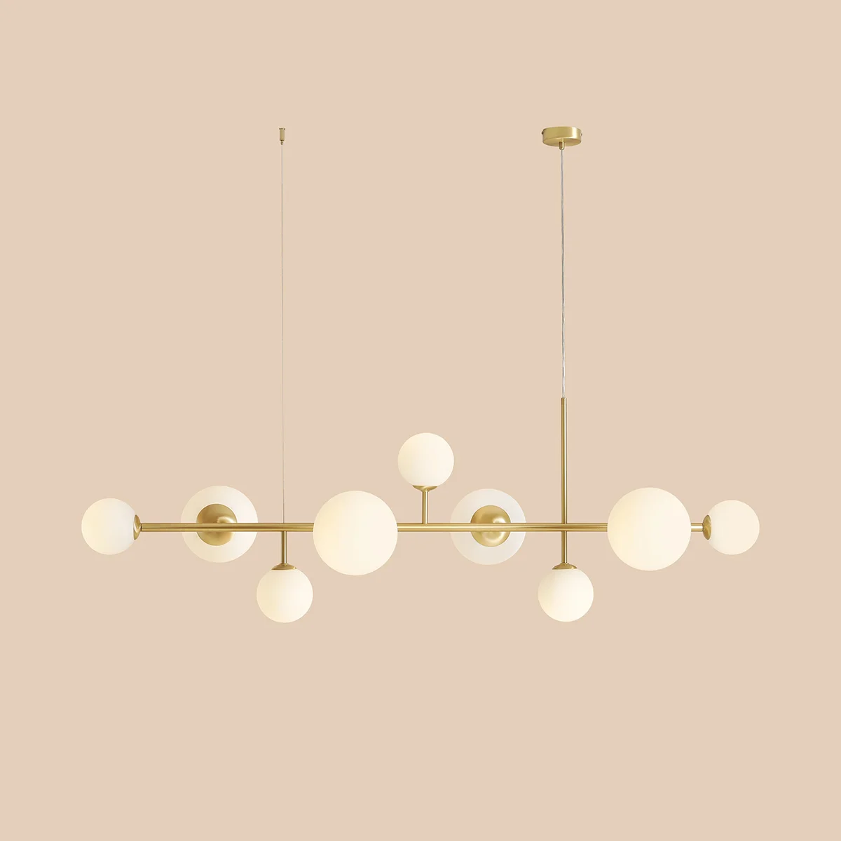 Lampa posiada cztery matowe klosze o średnicy 20cm, wychodzące z boków oprawy oraz pięć mniejszych – 14cm, które sprawiają, że wydobywające się z niej światło pięknie rozprasza się we wnętrzu i nie jest spłaszczone.