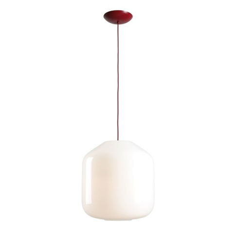 Lampa wisząca z bordowym przewodem w oplocie, klosz wykonany z opalowego szkła.