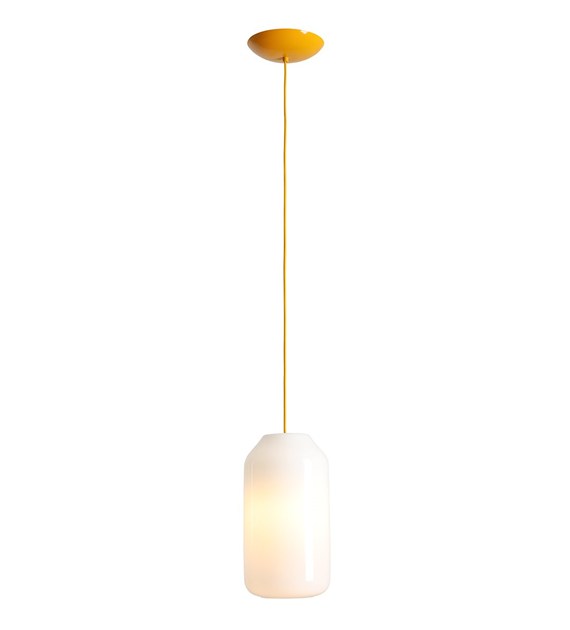 Lampa wisząca z żółtym przewodem w oplocie, klosz wykonany z opalowego szkła.
