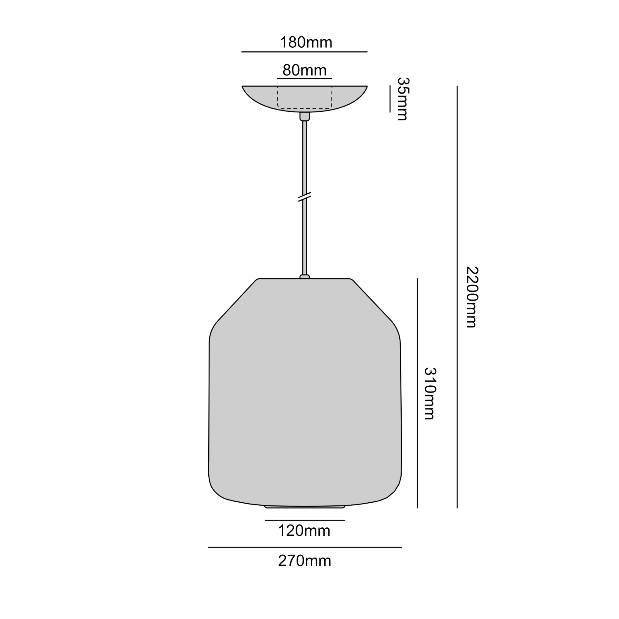 Średnica klosza: 27 cm, Wysokość klosza: 35 cm, Długość maksymalna: 220 cm
