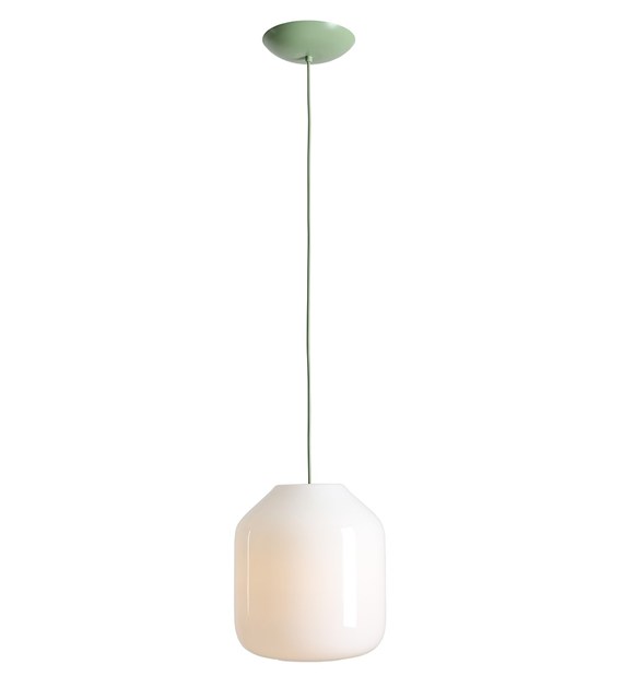 Lampa wisząca z zielonym przewodem w oplocie, klosz wykonany z opalowego szkła.