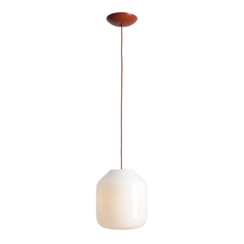 Lampa wisząca z przewodem w oplocie w kolorze ceglanym, klosz wykonany z opalowego szkła.